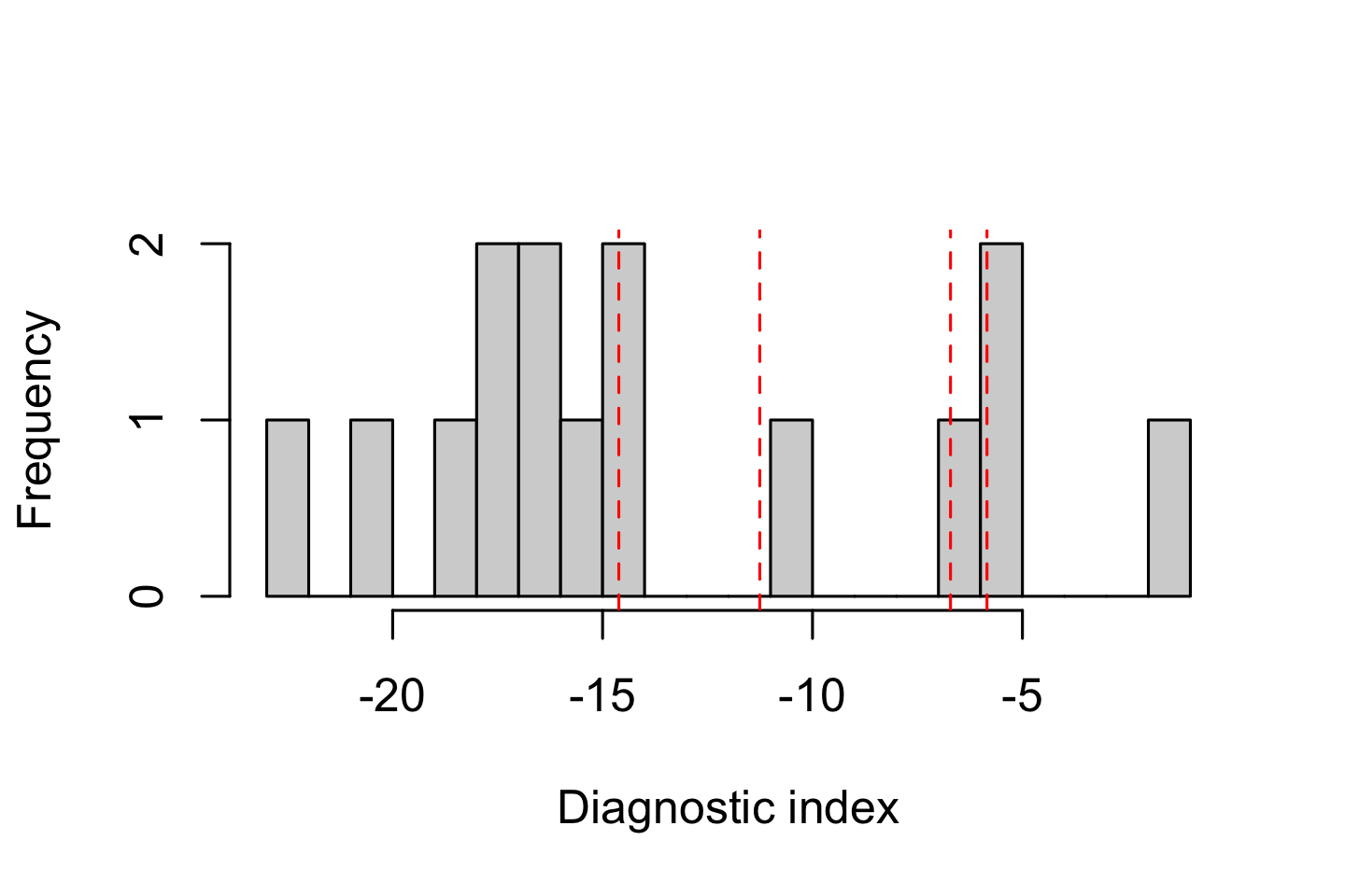 hist(DI$DI, xlab = "Diagnostic index", n = 20, main = "")