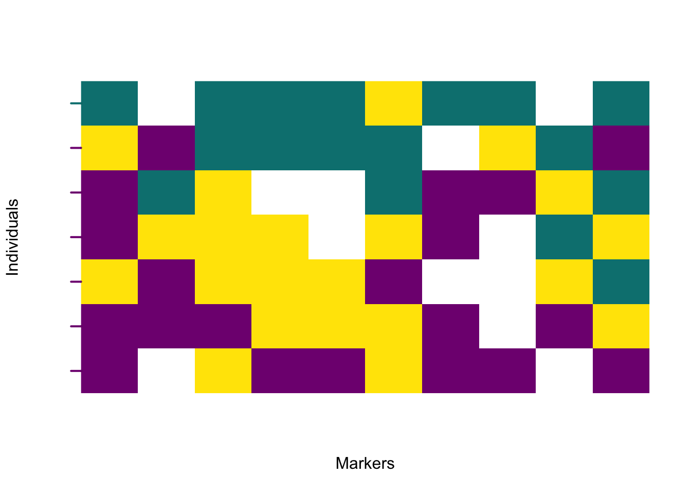 Colours correspond to genotype states: by default, purple and green mark the two homozygote classes (0